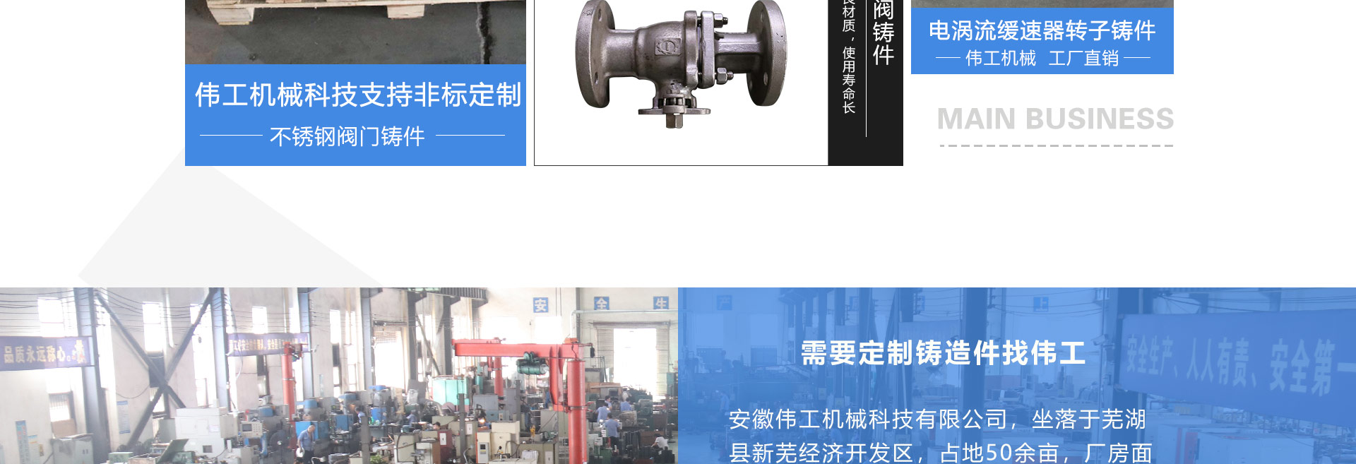 安徽偉工機(jī)械科技有限公司,坐落于安徽蕪湖新蕪經(jīng)濟(jì)開(kāi)發(fā)區(qū),是一家専業(yè)從事鑄造產(chǎn)品設(shè)計(jì)、研發(fā)、生產(chǎn)、銷售于一體的企業(yè),公司為客戶的產(chǎn)品提供多樣的技術(shù)支持與設(shè)計(jì),公司主要鑄造技術(shù)有潮模砂鑄造、硅溶膠精鑄工藝。主要產(chǎn)品有:不銹鋼閥門(mén)配件、泵閥配件、汽車配件、工業(yè)管道配件、工程機(jī)械配件、汽車配件等。材質(zhì)為:低合金鋼、304、316、316L、鉻鉬鋼、哈氏合金、碳鋼、雙相鋼等。公司已先后通過(guò)ISO9001和TS16949等多種體系審核,以完備的管理手段和齊全的檢測(cè)設(shè)備滿足客戶需求,進(jìn)的設(shè)備,専業(yè)的技術(shù),嚴(yán)謹(jǐn)?shù)墓芾恚€(wěn)定的質(zhì)量。服務(wù)客戶,鑄造未來(lái),偉工誠(chéng)摯的歡迎新老客戶共同商洽合作